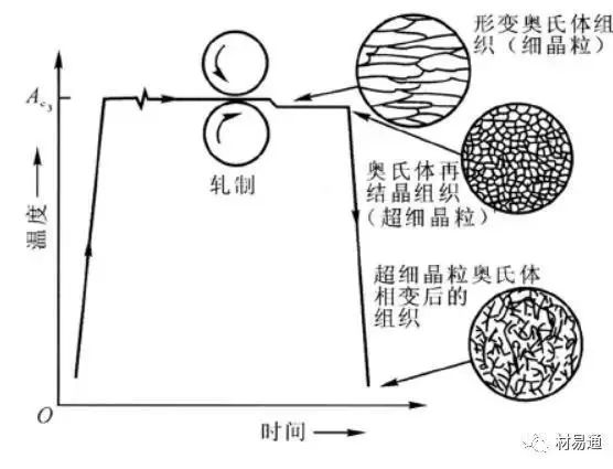 如圖2所示。其過程是先將鋼加熱至略高于Ac3的溫度,使之奧氏體化,隨后進行熱軋,使奧氏體發(fā)生強烈的形變,接著再等溫保持適當時間,使形變奧氏體發(fā)生起始再結晶,并于晶粒尚未開始長大之前進行淬火。
