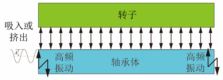 擠壓膜氣體軸承的工作原理如圖5所示。振子驅(qū)動(dòng)下板高頻振動(dòng)擠壓間隙內(nèi)的氣體,由于振動(dòng)速度較快且氣體存在黏滯性,導(dǎo)致間隙內(nèi)一個(gè)周期內(nèi)的平均氣壓大于環(huán)境氣壓,進(jìn)而產(chǎn)生作用于上板的懸浮力。